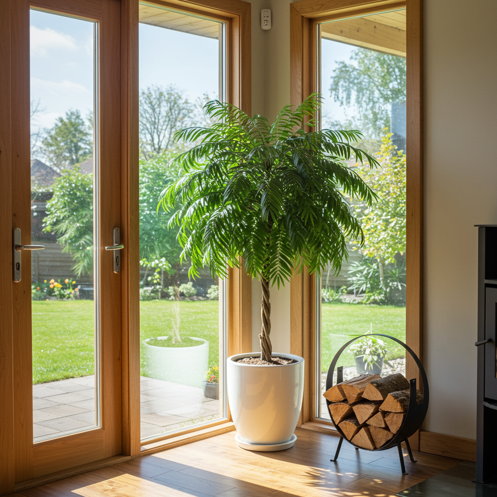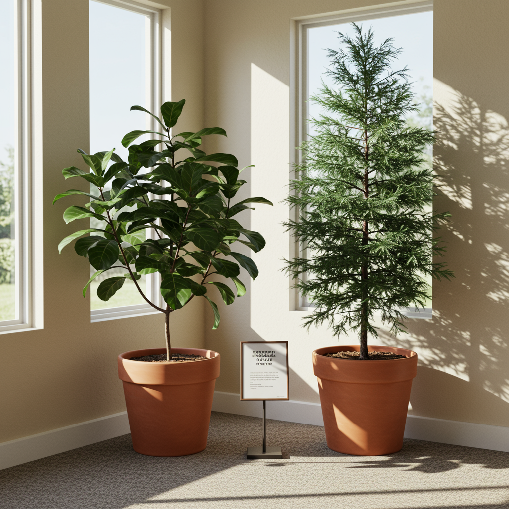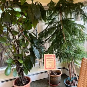 From left to right - our Norfolk at the sale, next to a fiddle fig that I wouldn't spring for, on its first day home and now in its new pot!