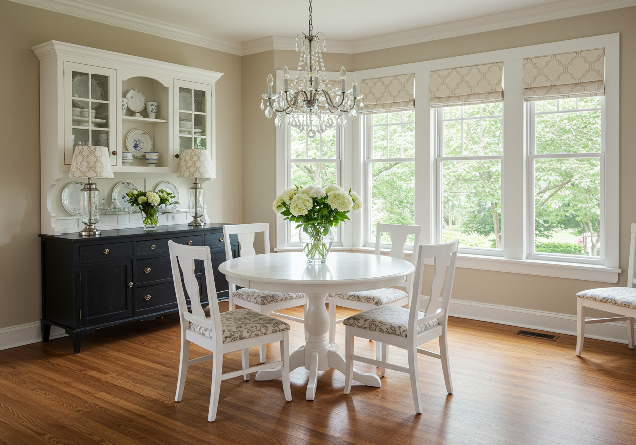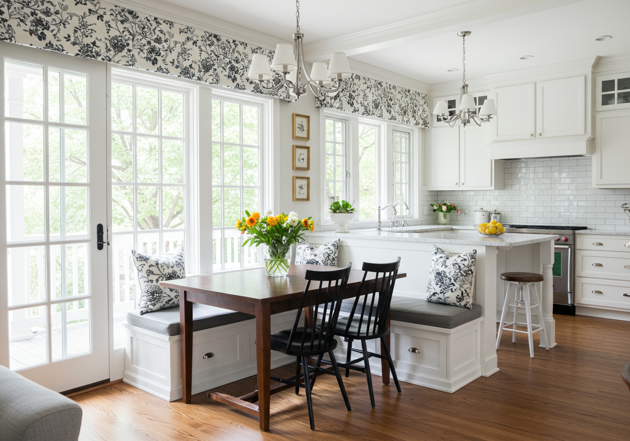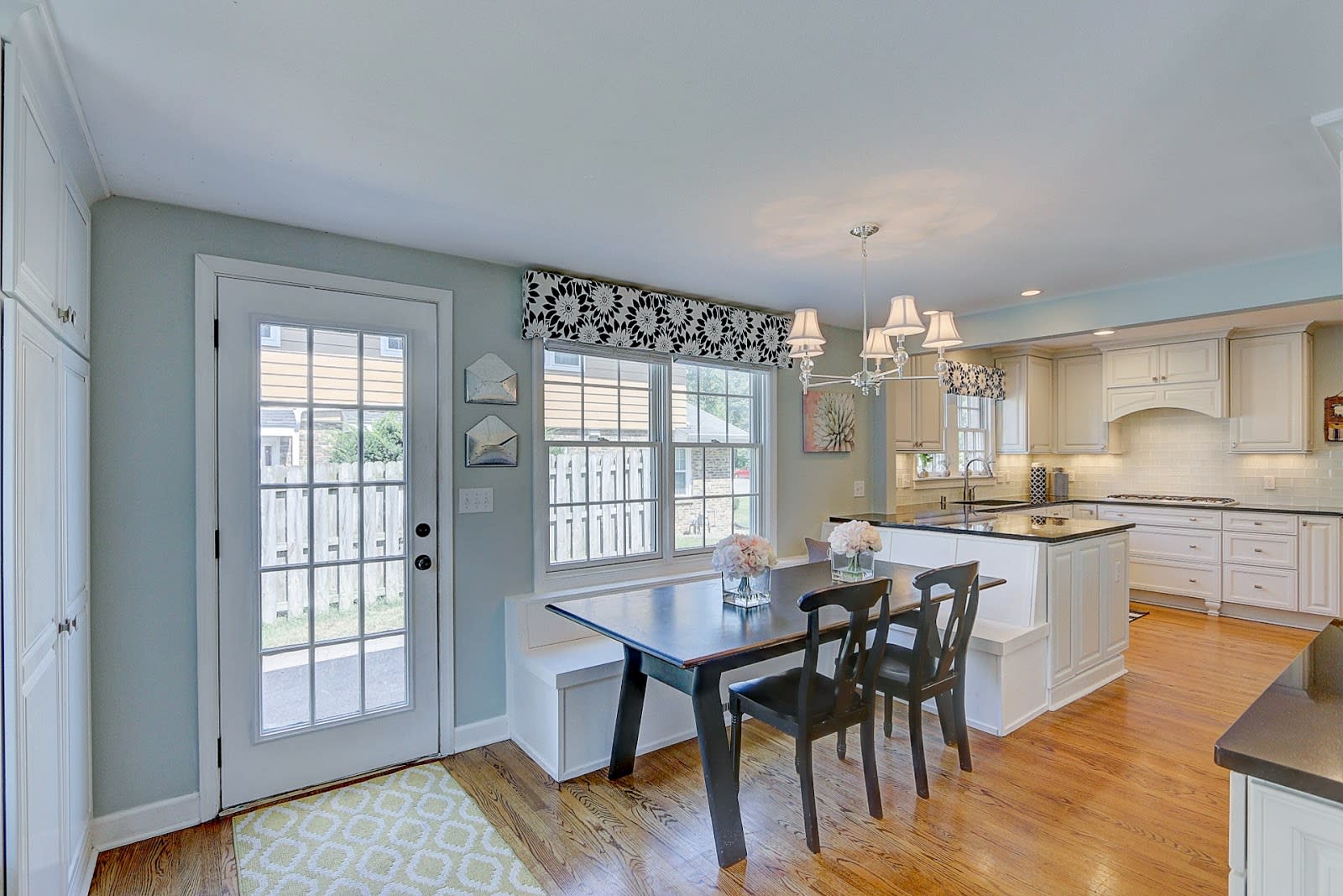 The current owners added the dinette area with a custom bench: there is room for everyone to enjoy dinner or work on crafts.