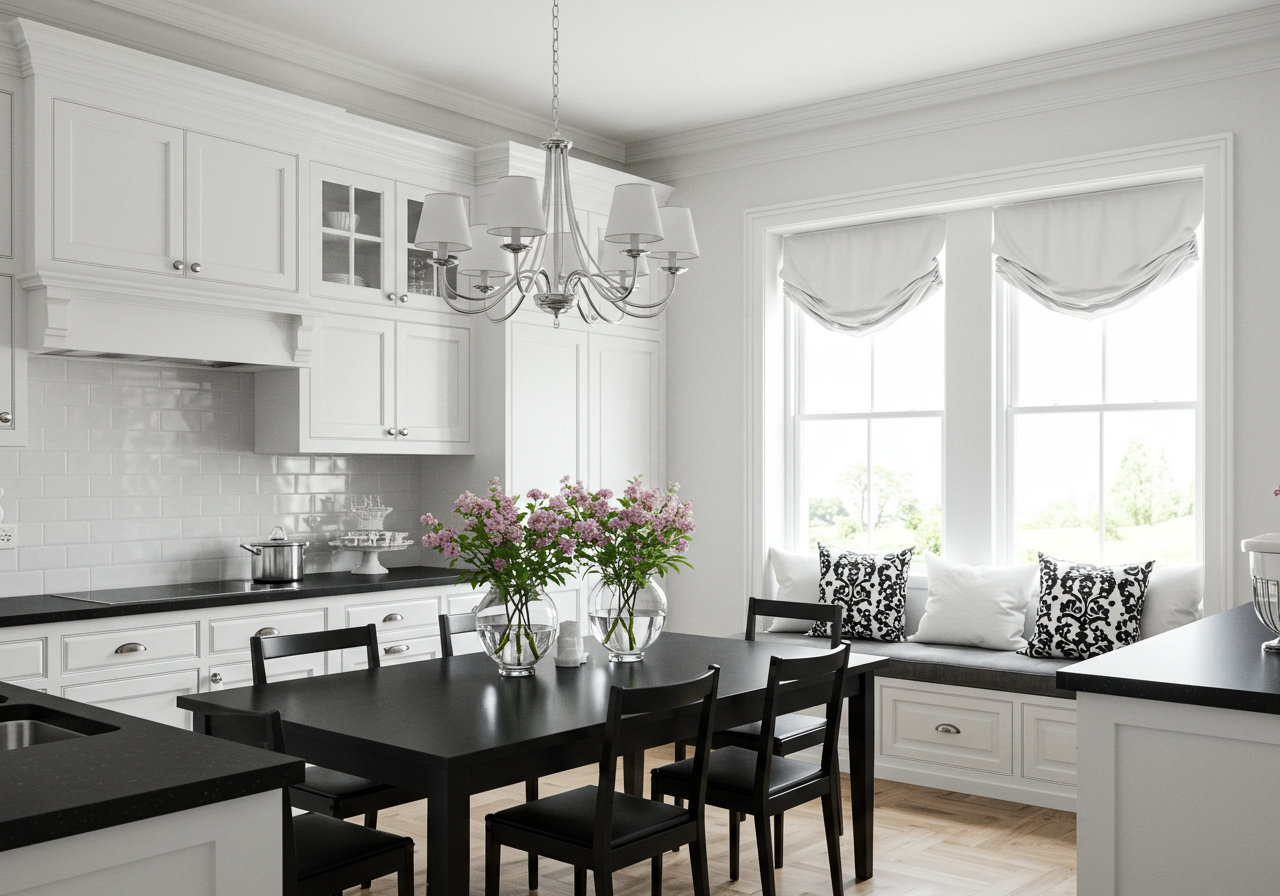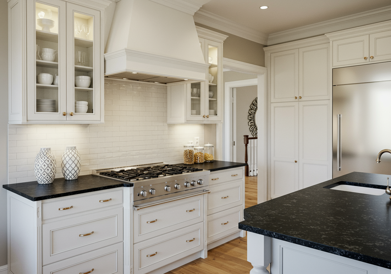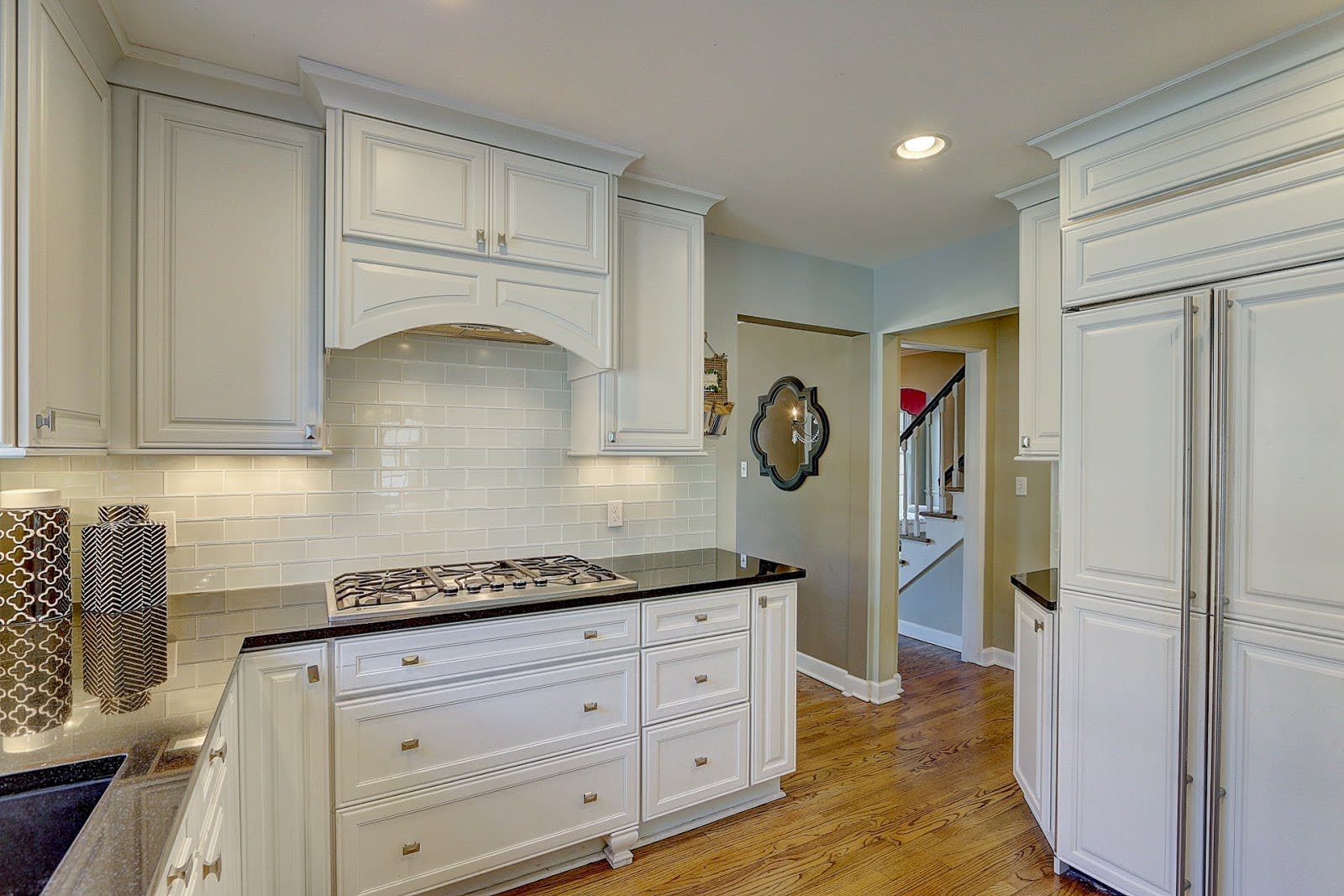 White custom cabinets, black granite counters and glass subway tile give it a timeless and clean look.